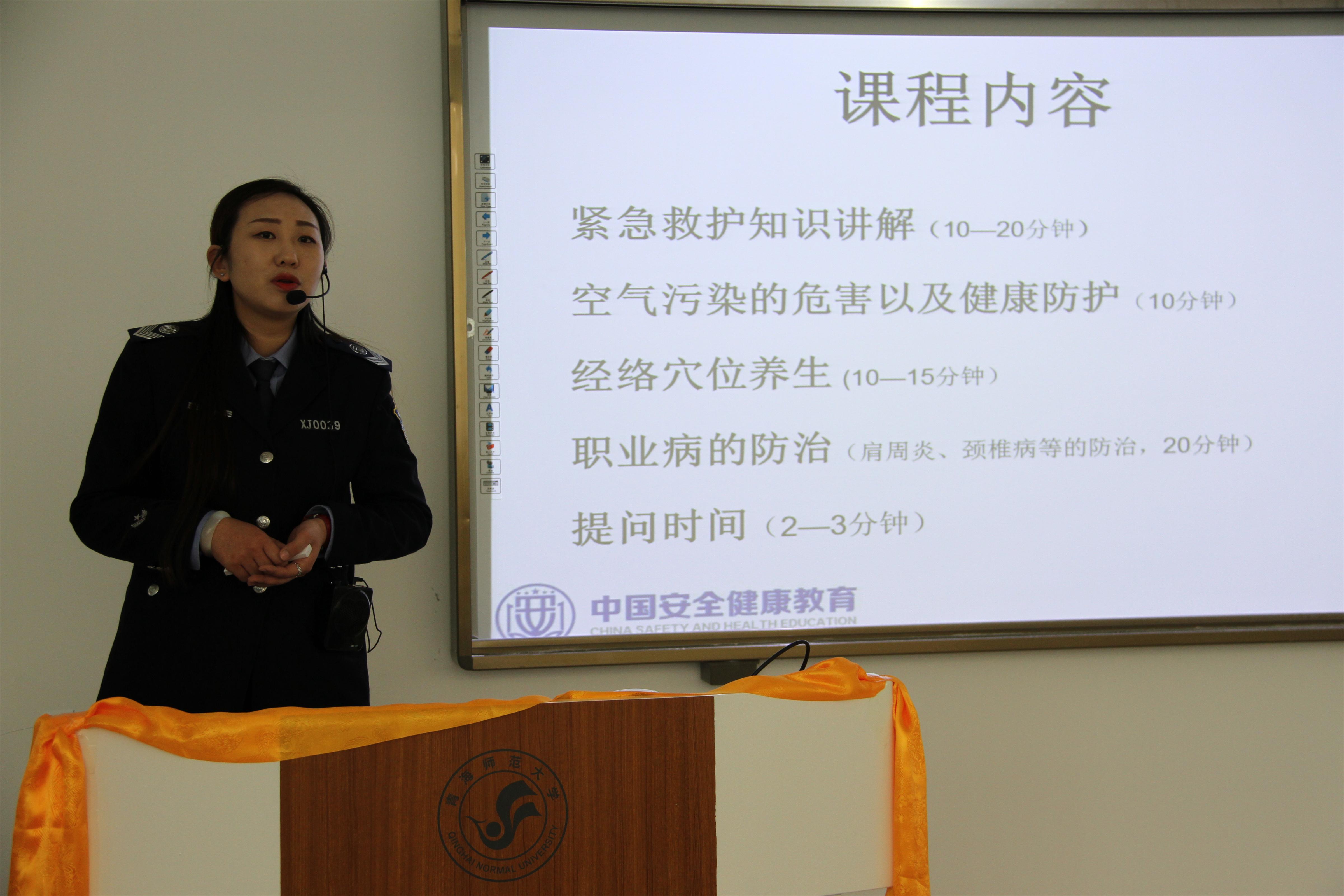 在博雅楼0428室开展了以卫生安全、紧急救护,环境污染的危害以及健康防护知识,职业病亚健康普及教育为主题的专题讲座,此次培训邀请了中国安全健康教育中心青海站主任蒋倩颖讲师授课,共80余名教职工参加了讲座。