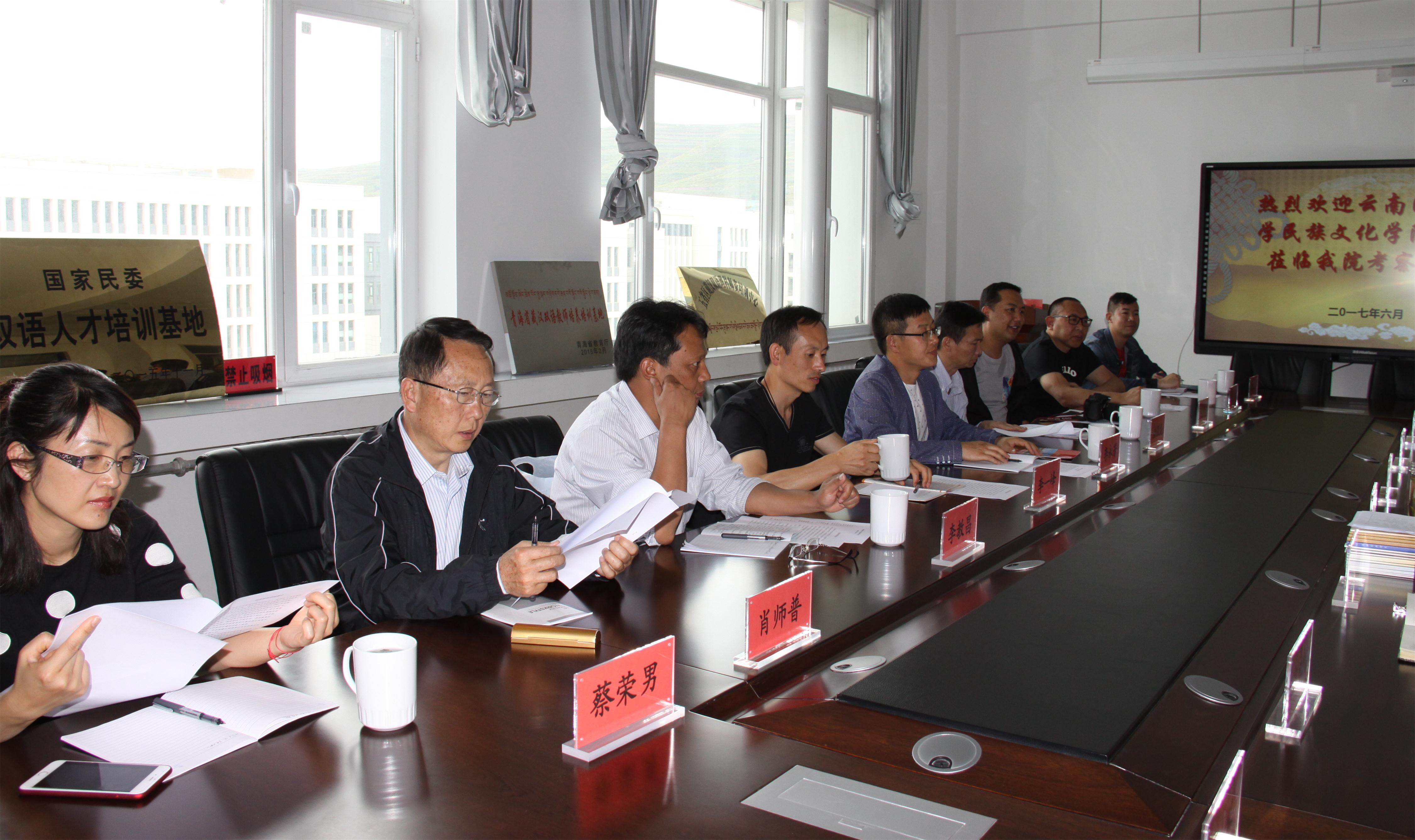 专业建设、民族教育国家标准建设、学术研究、学生就业、藏汉双语教材建设、学生学业帮扶、语言和学科教学改革以及专家文库建设情况向来宾做了重点介绍。期间,宾主双方就教学改革等问题进行了广泛的讨论和交流。
