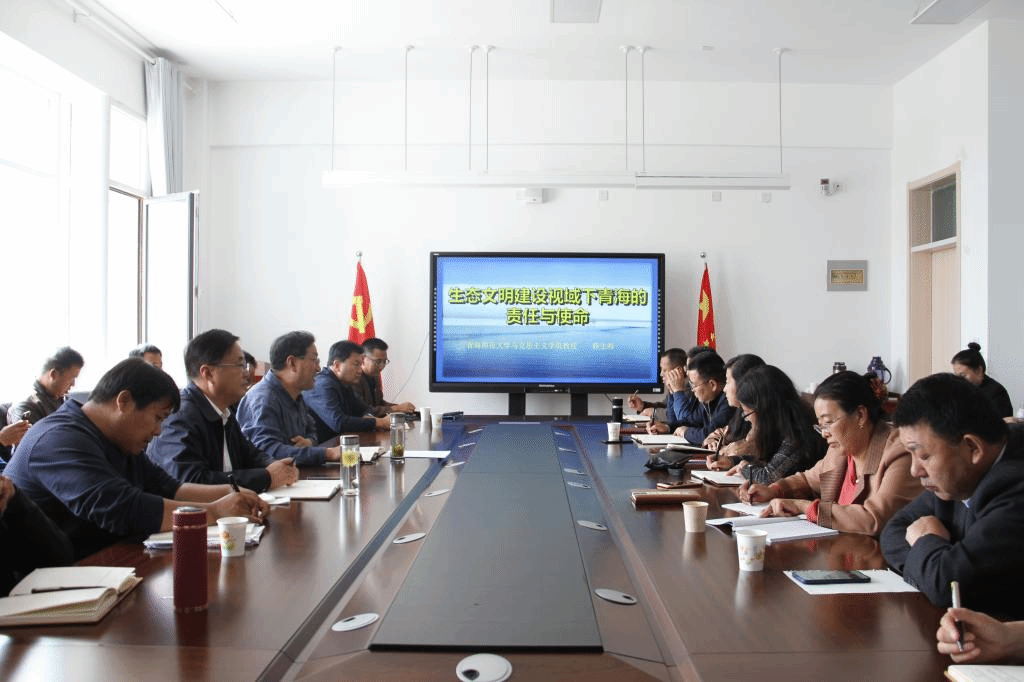 根据学院党委中心组理论学习活动安排,2020年9月23日下午,学院党委中心组召开生态环保理论学习扩大会议,邀请马克思主义学院教授、全省党课先锋教师薛生海作了《生态文明建设视域下青海的责任与使命》专题讲座。院党委中心组成员及机关、数学、物理、化学四个党支部共30余名党员参加了辅导。会议由院党委副书记吉太加主持。