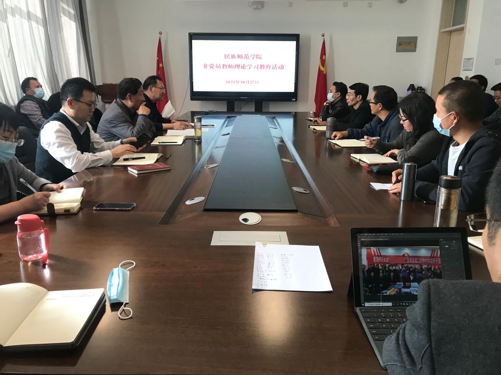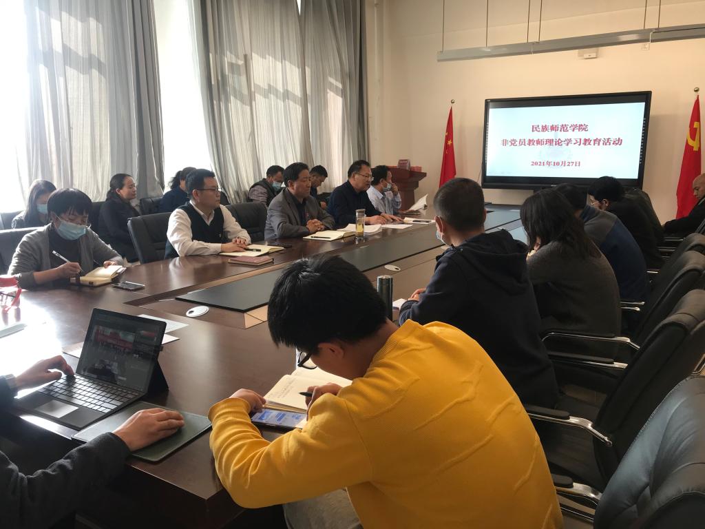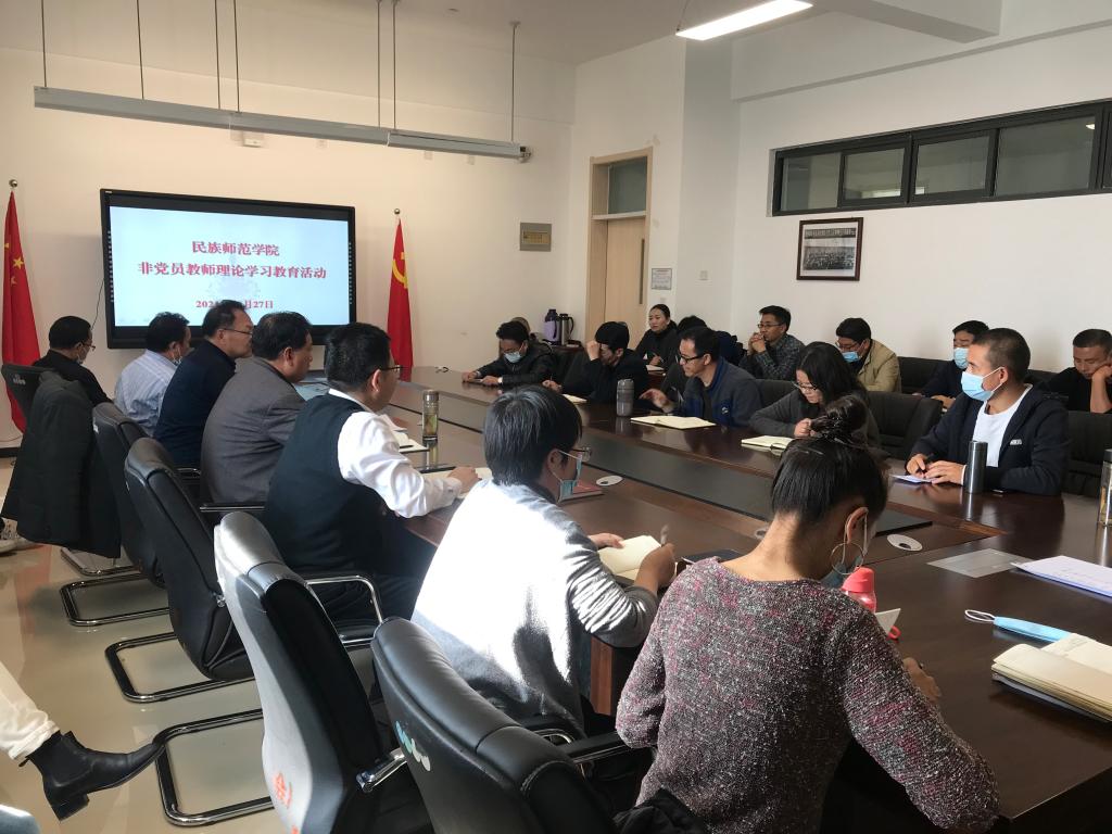 非党员教师集中理论学习教育活动在博雅楼四楼会议室进行。院党委书记吉太加、副书记王荣及全院30余名非党员教师参加了学习教育活动。活动由院党建办刘云峰主持。